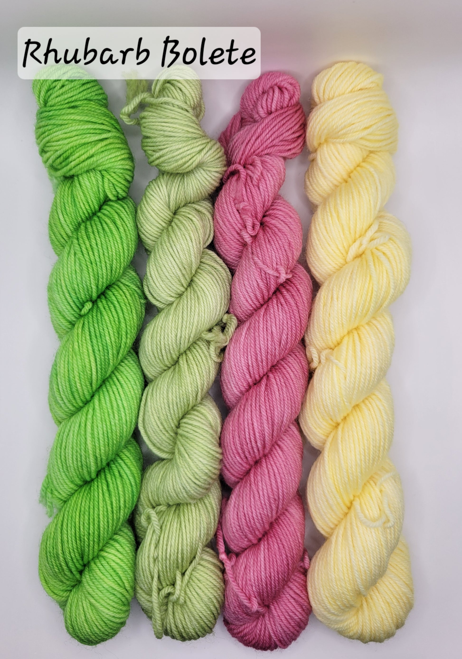 - Rhubarb Bolete (Lime squeeze green, Avocado green, Watermelon pink and Hollandaise yellow)